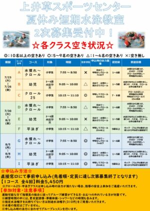 2024年07月18日:【7/19 18:00更新】夏休み短期水泳教室 二次募集空き状況について